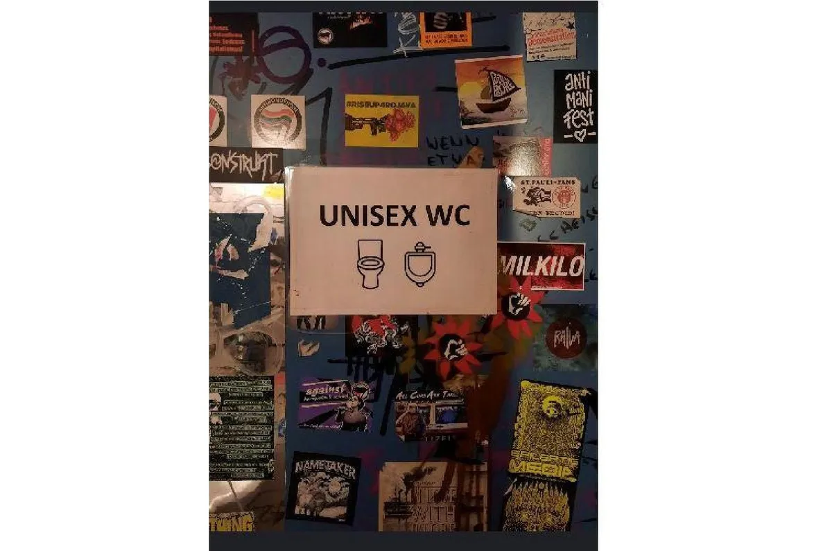 A természetesen „uniszex” mosdó ajtajára is kiragasztották az ANTIFA propaganda anyagait.