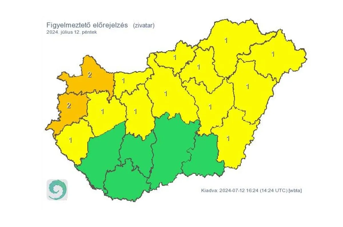 Zivatar veszélye miatt másodfokú (narancs) riasztást adott ki Győr-Moson-Sopron és Vas vármegye területére a HungaroMet Zrt. péntek délután.