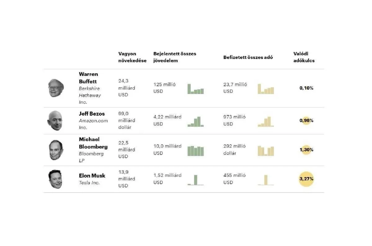 A beszámoló szerint Jeff Bezos - akit a Forbes jelenleg a világ leggazdagabb embereként tart számon - 2007-ben és 2011-ben nem fizetett jövedelemadót. 2014 és 2018 között az üzletember 4,22 milliárd dolláros jövedelemről számolt be, és 973 millió dollár adót fizetett. Vagyona mindeközben 99 milliárd dollárral nőtt. Elon Musk, aki jelenleg a világ második leggazdagabb embere, 2018-ban nem fizetett jövedelemadót. A Tesla alapítója 2014 és 2018 között összesen 1,52 milliárd dollár jövedelmet vallott be és 455 millió dollár adót fizetett be. Vagyona ebben az időszakban 13,9 milliárd dollárral nőtt - áll a portál jelentésében.