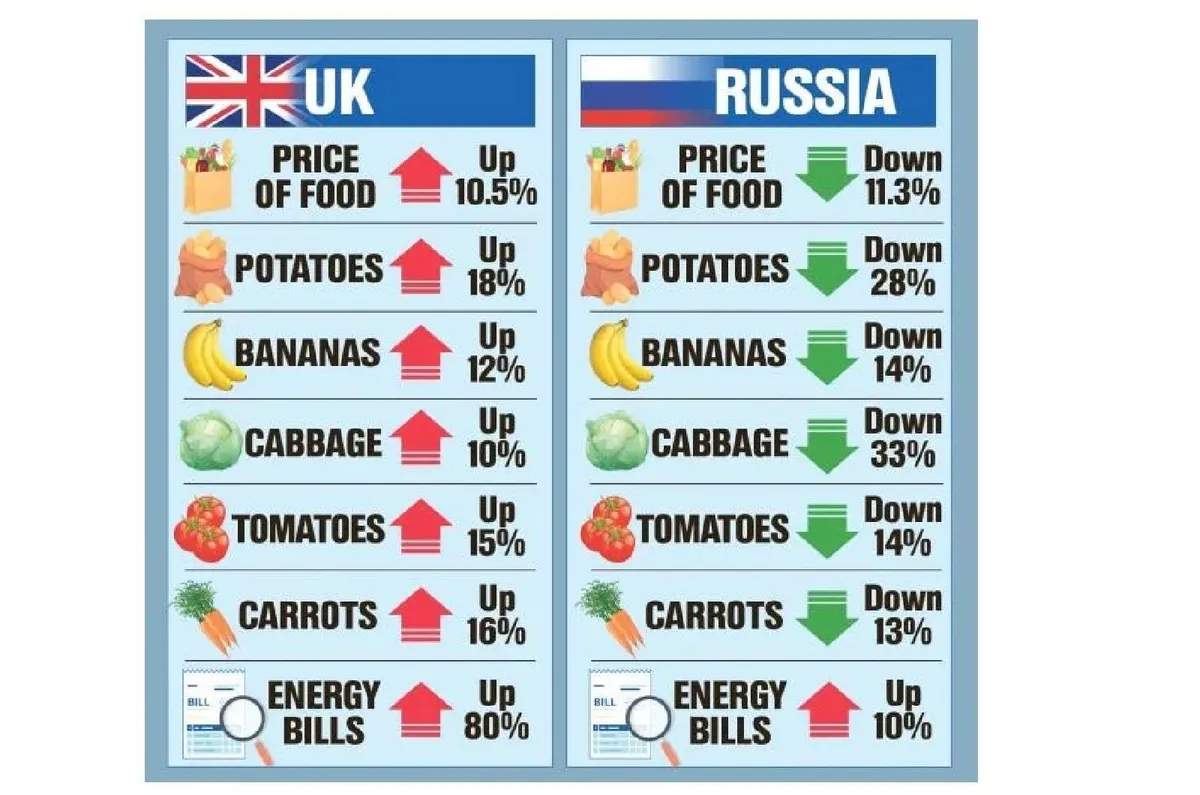 Az egyik legnagyobb brit újság arról is ír, hogy miközben az Egyesült Királyságban rekordmagasra, 1,91 font/gallonra emelkedett az üzemanyagár, addig Oroszországban a harmadáért, 63-78 penny-s áron vásárolhatnak a fogyasztók. Továbbá szentpétervári lakosokat kérdeztek arról, hogy mit tapasztalnak a háborúból. A válaszokból az derült ki, hogy a jövedelmük közel 10 százalékát kell télen fűtésre költeniük és ez egyáltalán nem fog nagy gondot okozni nekik.