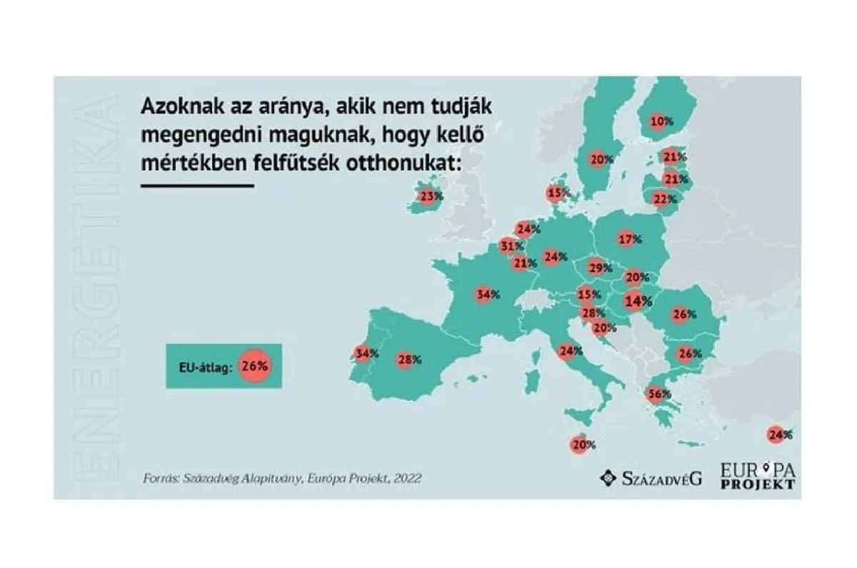 Az Eurostat adatai alapján 2021-ben az Európai Unió háztartásainak 6,9 százaléka (13,5 millió háztartás, 29,9 millió személy) egzisztenciális okokból nem volt képes kellő mértékben felfűteni otthonát, és 6,4 százalék (12,6 millió háztartás, 27,7 millió személy) fizetési elmaradásokkal küzdött. A Századvég 2022-es őszi adatfelvétele a helyzet drámai romlását vetíti előre1: úgy tűnik, hogy az energiaárak emelkedése miatt a lakosság jelentős része érintetté vált a két problémában. Az Európa Projekt-kutatás eredményei alapján az európai polgárok 26 százaléka (több mint 100 millió személy) nem képes megfelelően fűteni otthonát. Ahogyan azonban a lakossági tarifák emelkedésében, úgy a fűtési nehézségekkel küzdők számában is jelentős tagállami különbségek tapasztalhatók.