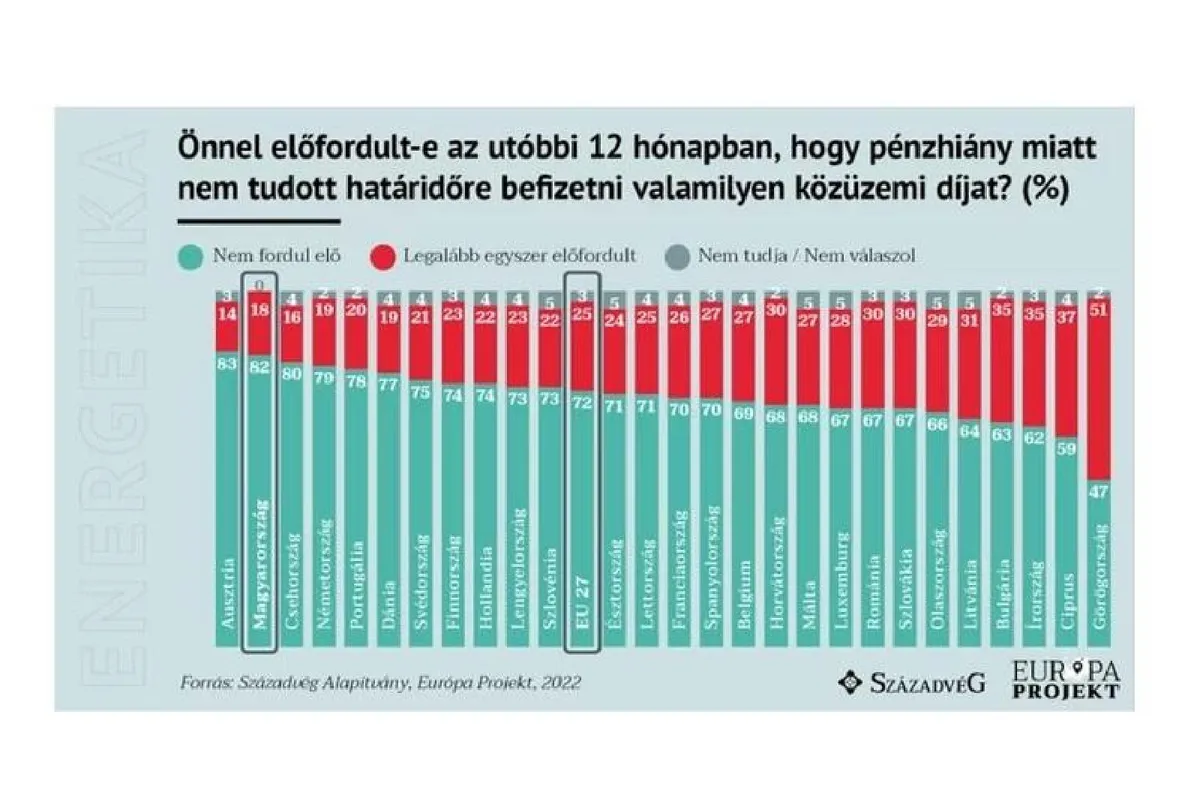 Minden negyedik válaszadóval legalább egyszer előfordult az (őszi adatfelvételhez képesti) elmúlt egy évben, hogy pénzhiány miatt nem tudta határidőre befizetni valamelyik közüzemi díját. A helyzet ebben a kategóriában is Görögországban a legsúlyosabb, ahol a felnőtt lakosság 51 százaléka érintett. Továbbá a lakosság több mint egyharmada fizetési nehézségekkel küzd Cipruson (37 százalék), valamint Írországban és Bulgáriában (35-35 százalék) is. Magyarország relatív helyzete a fizetési elmaradások kategóriában is kedvező: az érintettek aránya Ausztria (14 százalék) és Csehország (16 százalék) után a harmadik legalacsonyabb: 18 százalék.