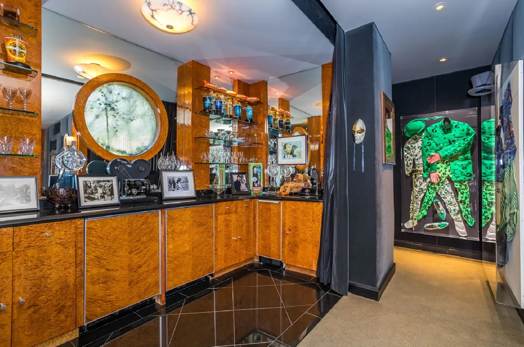 A lakást vitrinek díszítik, amikben Jim Carrey az ikonikus jelmezeit tárolja. Megtalálható A kábelbarát-ból ismerhető kék overáll, a Grincs-ből a mikulás jelmez és a Mindörökké Batman-ben viselt ruhája is.
