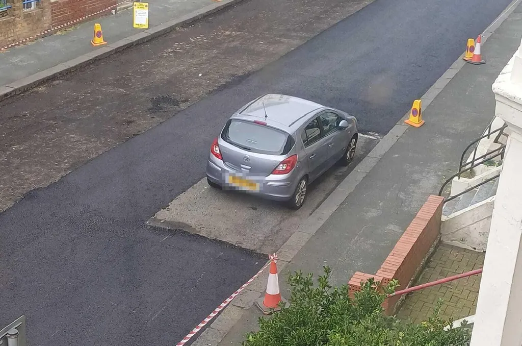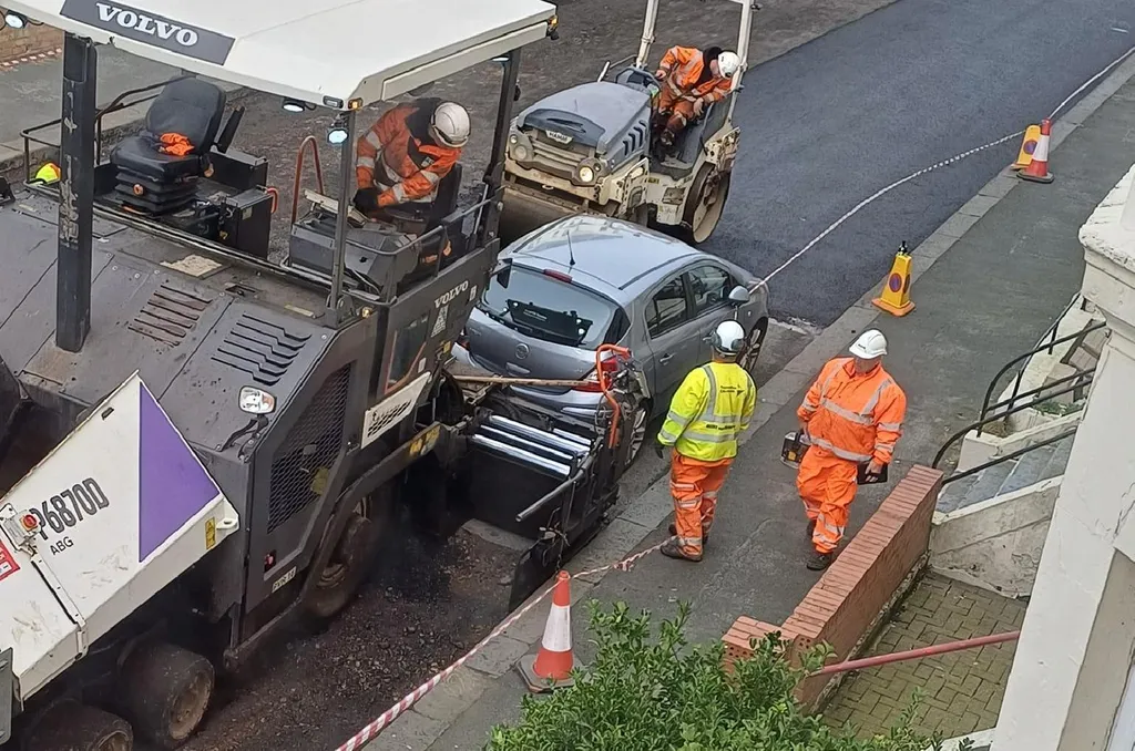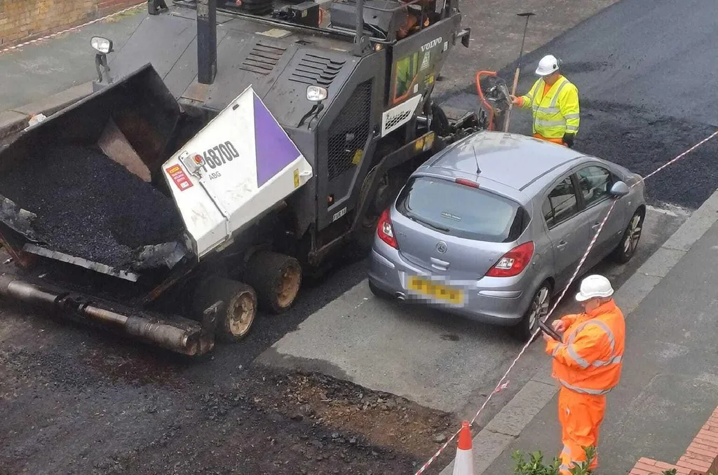 A munkások fogták magukat és körbeaszfaltozták a munkavégzésüket akadályozó ezüst Corsát.