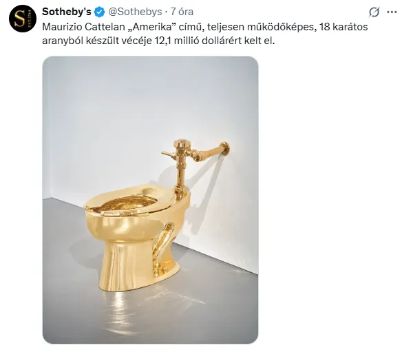 A 101 kilogramm 18 karáros aranyból készült vécé teljesen működőképes. A kikiáltási árat az árverés napjának aranyára alapján határozták meg - közölte a Sotheby's az árverés előtt. Kedden 101 kilogramm 18 karátos arany ára 10 millió dollár (3,3 milliárd forint) volt - közölte az MTI.