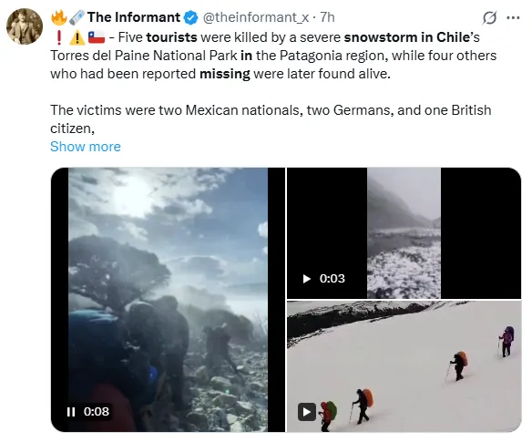 Egyelőre nem ismert a még eltűntként nyilvántartott turisták nemzetisége. A Torres del Paine Nemzeti Park, kiugró hegycsúcsaival és szubpoláris erdőségeivel, mintegy 1810 négyzetkilométeren terül el, és évente több százezer látogatót vonz.