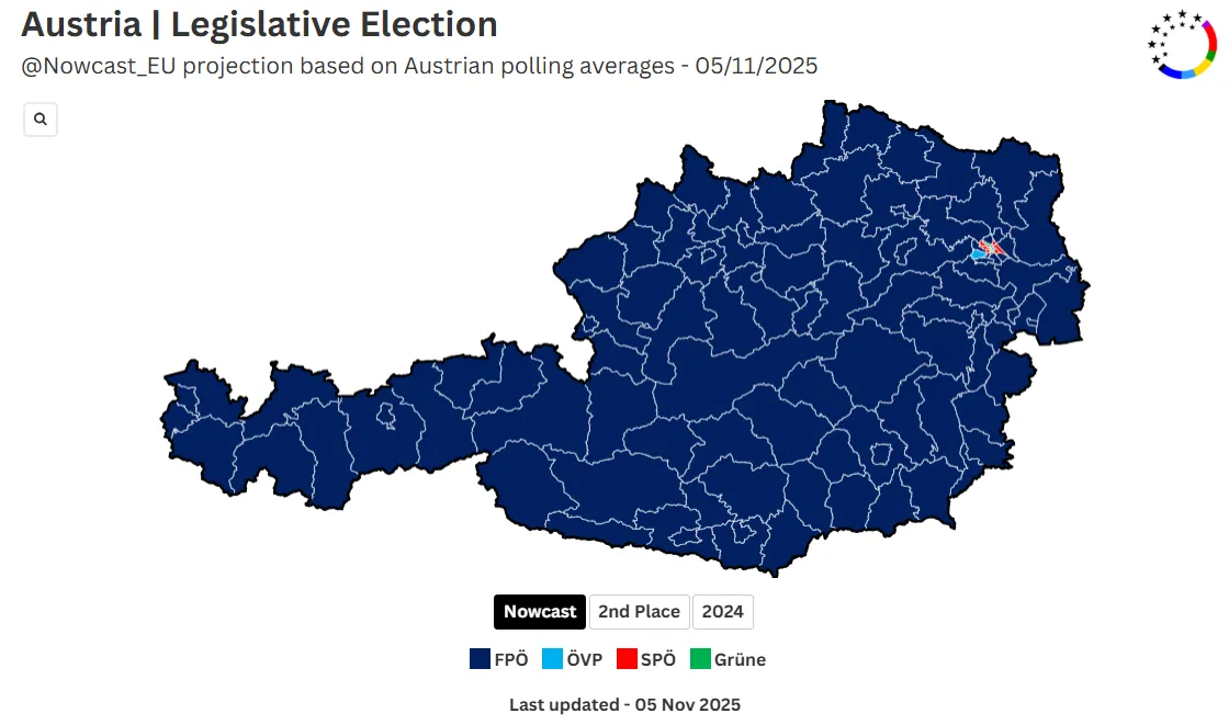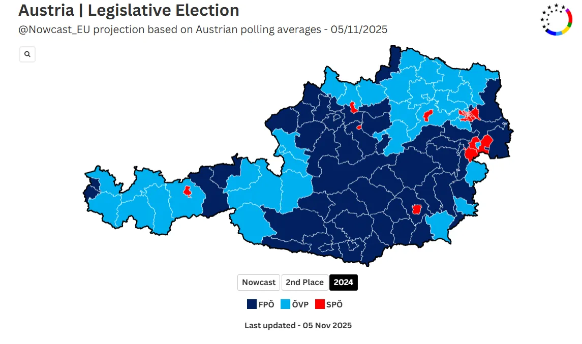 Meglepő térkép látott napvilágot Ausztriáról. Egy közvélemény-kutatásokkal foglalkozó oldal becslést készített arról, hogy a mostani párttámogatottsági adatok mellett az ország járásaiban ki végezne az első helyen. Bécs néhány kerületét leszámítva minden járásban és városban is a bevándorlásellenes, és Ukrajna-szkeptikus Osztrák Szabadságpárt (FPÖ) nyerne – írta meg a Mandiner.