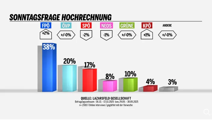 Az ÖVP 20, a szintén kormányzó Osztrák Szociáldemokrata Párt (SPÖ) 17, míg a liberális NEOS 8 százalékon állt. A három kormánypárt együttes támogatottsága 45 százalék volt, és csupán 85 mandátumot szereztek volna a parlamentben. A többséghez 92 mandátumra lenne szükség.