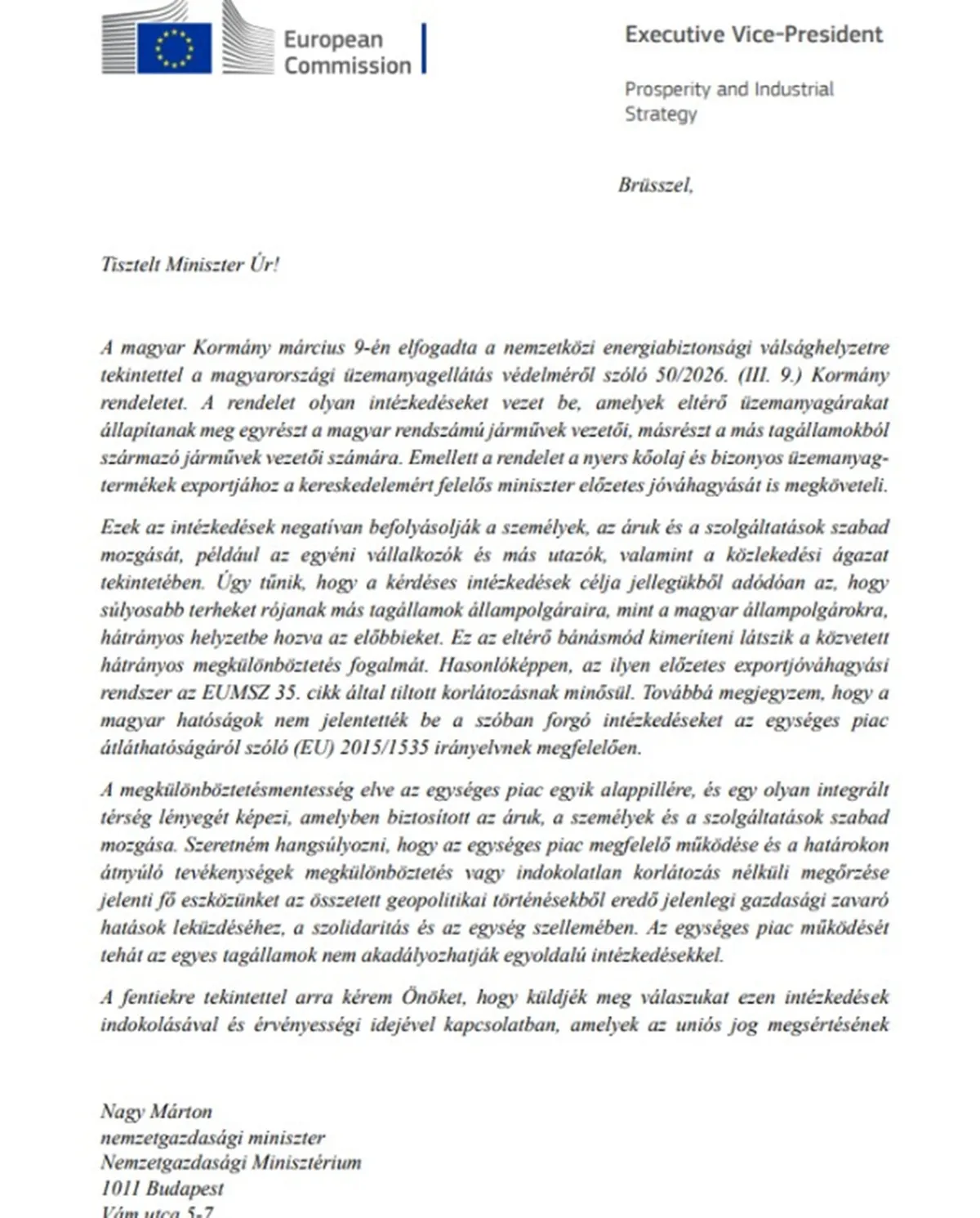 Az egységes piac működését tehát az egyes tagállamok nem akadályozhatják egyoldalú intézkedésekkel – olvasható a levélben.