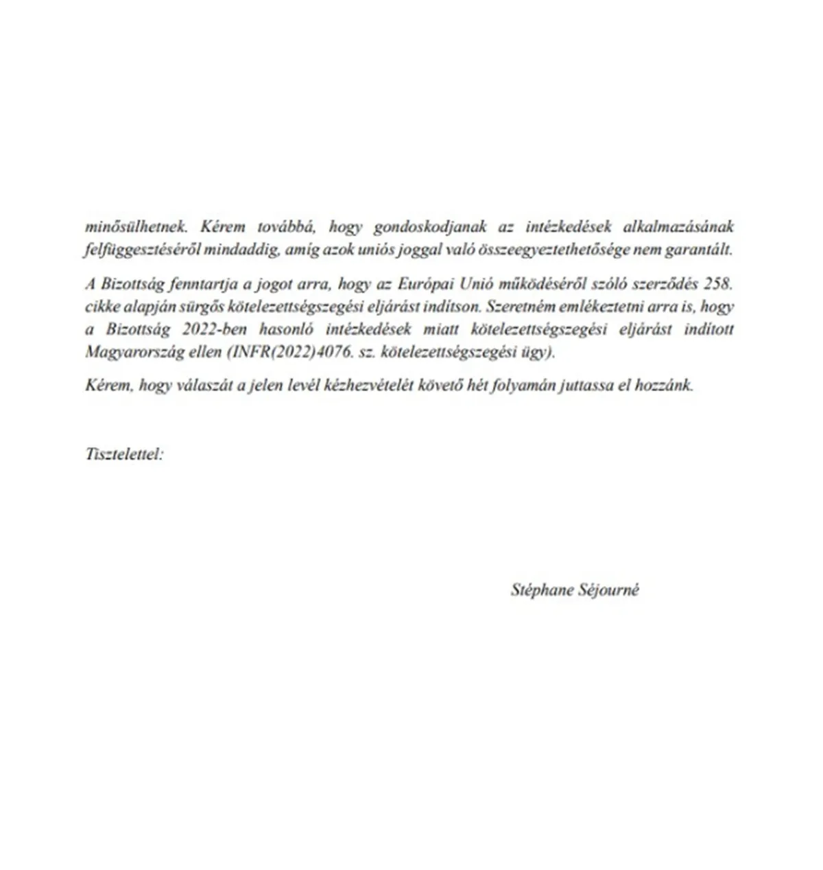 A fentiekre tekintettel arra kérem Önöket, hogy küldjék meg válaszukat ezen intézkedések indokolásával és érvényességi idejével kapcsolatban, amelyek az uniós jog megsértésének minősülhetnek. Kérem továbbá, hogy gondoskodjanak az intézkedések alkalmazásának felfüggesztéséről mindaddig, amíg azok uniós joggal való összeegyeztethetősége nem garantált. A Bizottság fenntartja a jogot arra, hogy az Európai Unió működéséről szóló szerződés 258. cikke alapján sürgős kötelezettségszegési eljárást indítson – szerepel a levélben. Szeretném emlékeztetni arra is, hogy a Bizottság 2022-ben hasonló intézkedések miatt kötelezettségszegési eljárást indított Magyarország ellen (INFR(2022)4076. sz. kötelezettségszegési ügy).