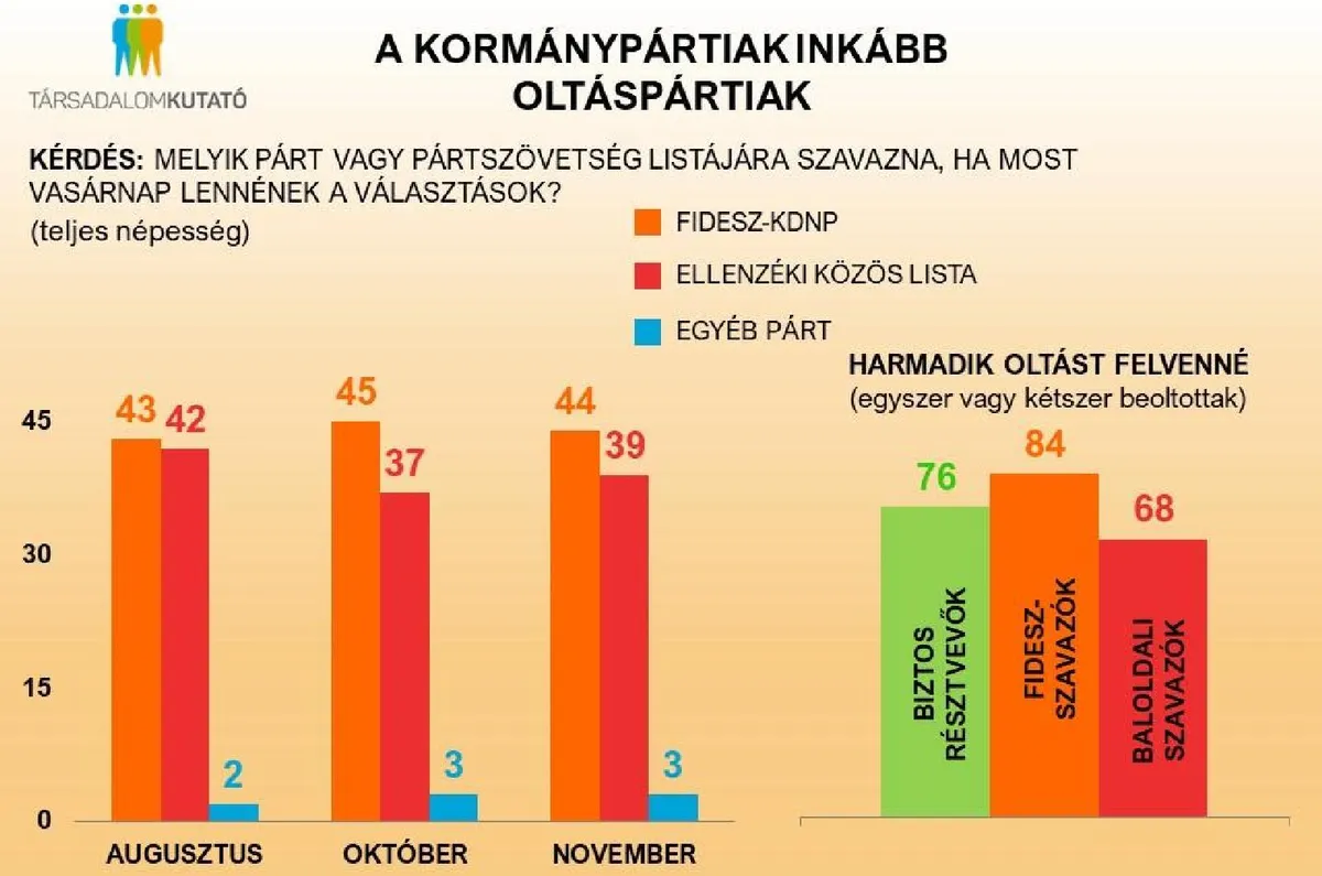 A Fidesz előnye továbbra is jelentős a baloldali kihívójával szemben: a kormánypárttal a teljes népesség 44, az ellenzéki közös listával 39 százaléka szimpatizál. Az ellenzék hátrányának egyik oka megosztottsága több kérdésben, például a koronavírus kapcsán. Míg az első és második oltással rendelkező fideszesek 84 százaléka szándékozik felvenni a harmadik oltást is, a baloldali szavazótáborban ez az arány csak 68 százalék.