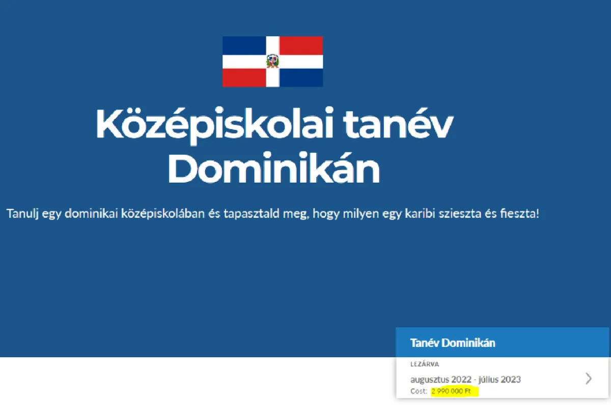 Az AFS Nemzetközi Cserediák Alapítvány oldalán nagy betűkkel hirdetik a „Középiskolai tanév Dominikán” című cserediák-programot, melynek keretében a nebuló egy teljes tanévet tölt a célországban. Ez 10 hónapot jelent, mely idő alatt egy ottani középiskolába jár, valamint egy fogadó családnál lakik. Az ígéretesnek hangzó tanulmány költsége 2.990.000 forint, ami jól mutatja, hogy nem minden szülő engedheti meg magának, hogy egy dominikai középiskolába járassa a gyermekét.