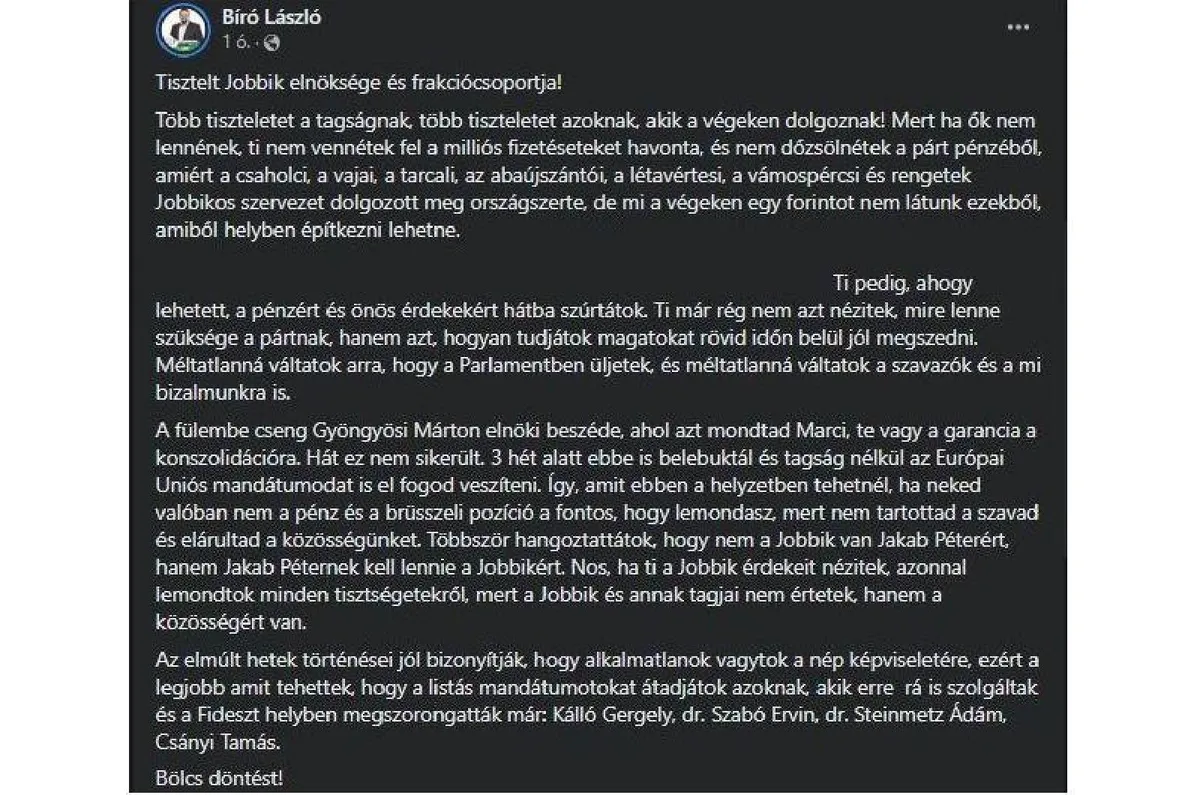 Bíró szerint az új vezetők „hátba szúrták” a pártot és alkalmatlannak nevezi őket, azonnali távozásukat követelve.