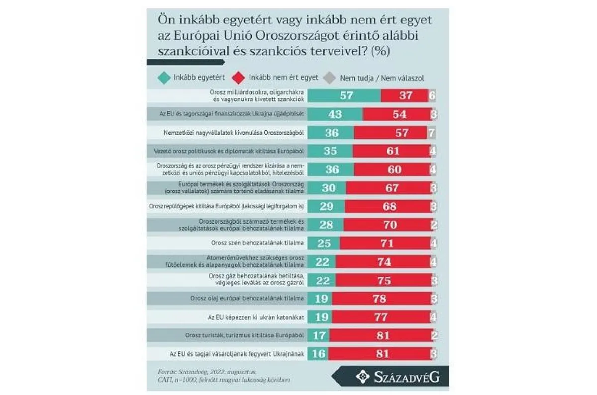 A megkérdezettek túlnyomó többsége (78 százalék) nem támogatja az orosz olaj Európába történő behozatalának tilalmát, ukrán katonák kiképzését az Európai Unió által (77 százalék), az orosz gáz behozatalának betiltását és az orosz gázról történő végleges leválást (75 százalék), továbbá az atomerőművekhez szükséges orosz fűtőelemek és alapanyagok behozatalának tilalmát (74 százalék). A magyarok hasonló mértékben elutasítóak az orosz szén behozatalának tilalmával (71 százalék), az Oroszországból származó termékek és szolgáltatások európai behozatalának tilalmával (70 százalék), illetve a civil légiforgalomban közlekedő orosz repülőgépek Európából történő kitiltásával (68 százalék), valamint az európai termékek és szolgáltatások Oroszország számára történő eladásának tilalmával (67 százalék) kapcsolatban is.