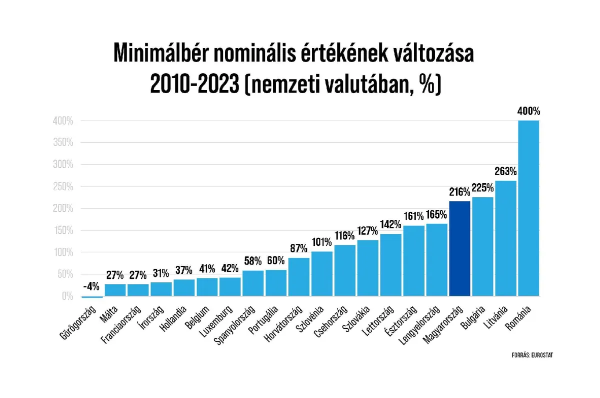 Az Eurostat adatai alapján 2010 és 2023 között Magyarországon a minimálbér 216 százalékkal nőtt, azaz több mint megháromszorozódott.