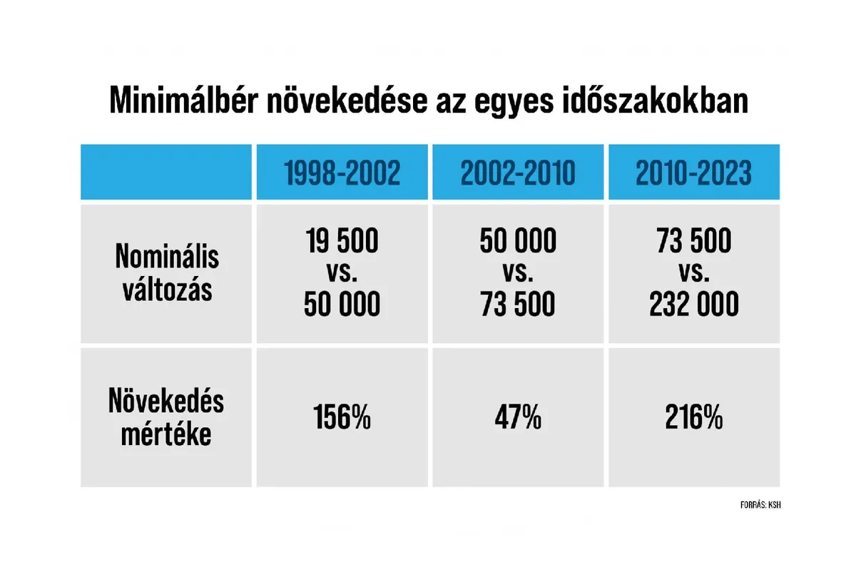 2010 és 2023 között a minimálbér és a garantált bérminimum is több mint háromszorosára emelkedett. Előbbi 73 500 forintról 232 000 forintra nőtt, utóbbi 89 500 forintról 296 400 forintra. Így ma már a minimálbér is magasabb, mint a szocialista kormányzások idején az átlagbér volt.