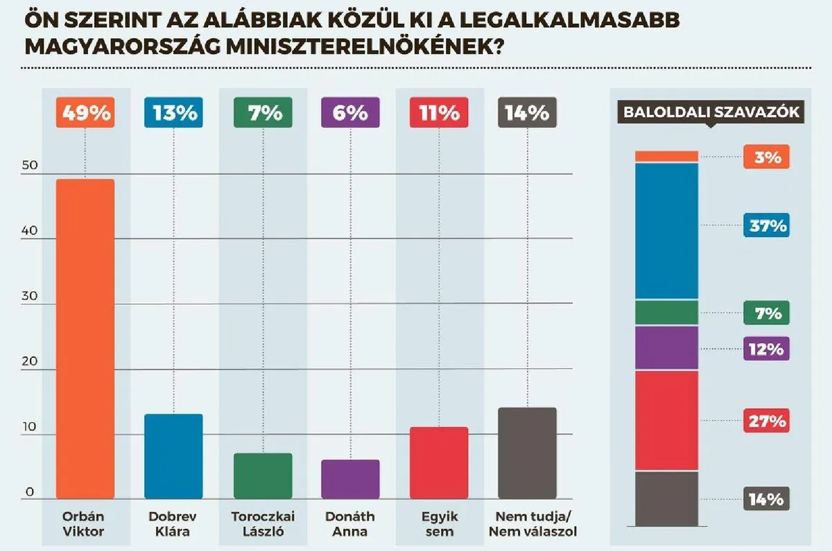 Mint ismert, az elmúlt hetekben az ellenzék több vezetője, Toroczkai László, Donáth Anna és Dobrev Klára, hétvégén pedig Orbán Viktor is megtartotta évértékelő beszédét. A Nézőpont Intézet a reprezentatív kutatásában arra volt kíváncsi, hogy a jelenlegi politikai választékból kit tartanak a magyarok a legalkalmasabbnak Magyarország miniszterelnökének.