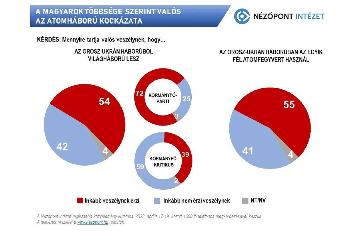 A Nézőpont Intézet kutatása szerint a magyar választók abszolút többsége (54 százalék) valós veszélynek érzi, hogy a szomszédban dúló regionális konfliktus világméretűvé válik. Ezzel szemben az optimisták táborába a szavazók 42 százaléka tartozik. A kormánypártiak háromnegyede (72 százalék) érzi úgy, hogy az orosz-ukrán háború folytatásával egy újabb világháború kitörését kockáztatjuk, negyedük (25 százalék) bizakodó, és nem tartja ezt valós veszélynek. Az ellenzéki szavazók több mint harmada (39 százalék) szintén valósnak tartja a világháború kockázatát, többségük (59 százalék) azonban nem tartja elképzelhetőnek a háború ilyen mértékű eszkalációját.