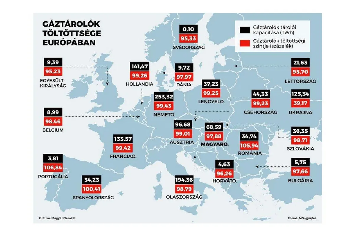 A nemzetközi adatokból az is kiderül, hogy Magyarország már áprilisban hozzáfogott a múlt télen elhasznált készletek pótlásához, a tárolók feltöltése azóta is folyamatos. Az uniós előírásban szereplő kilencvenszázalékos szintet hazánk már augusztusban elérte.