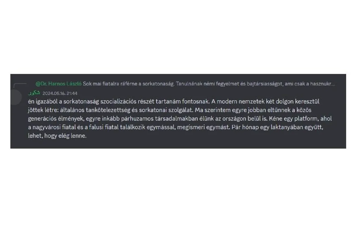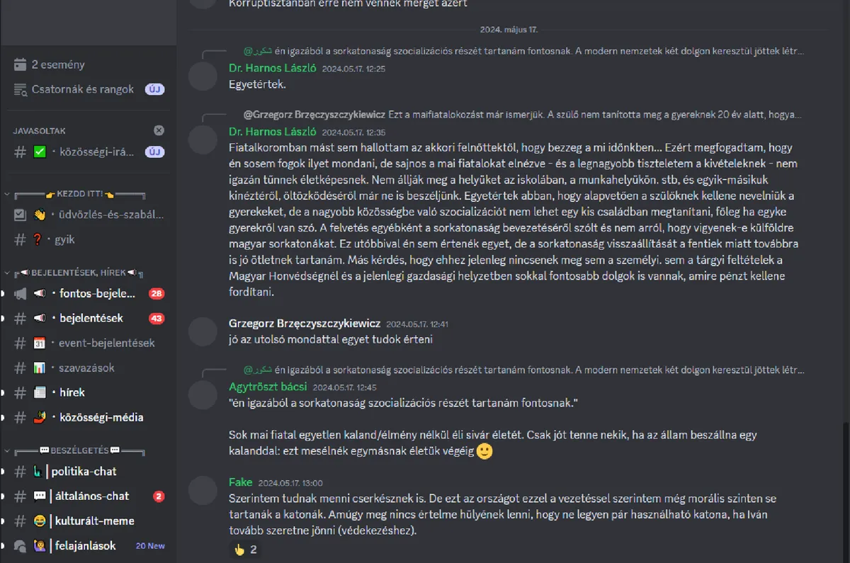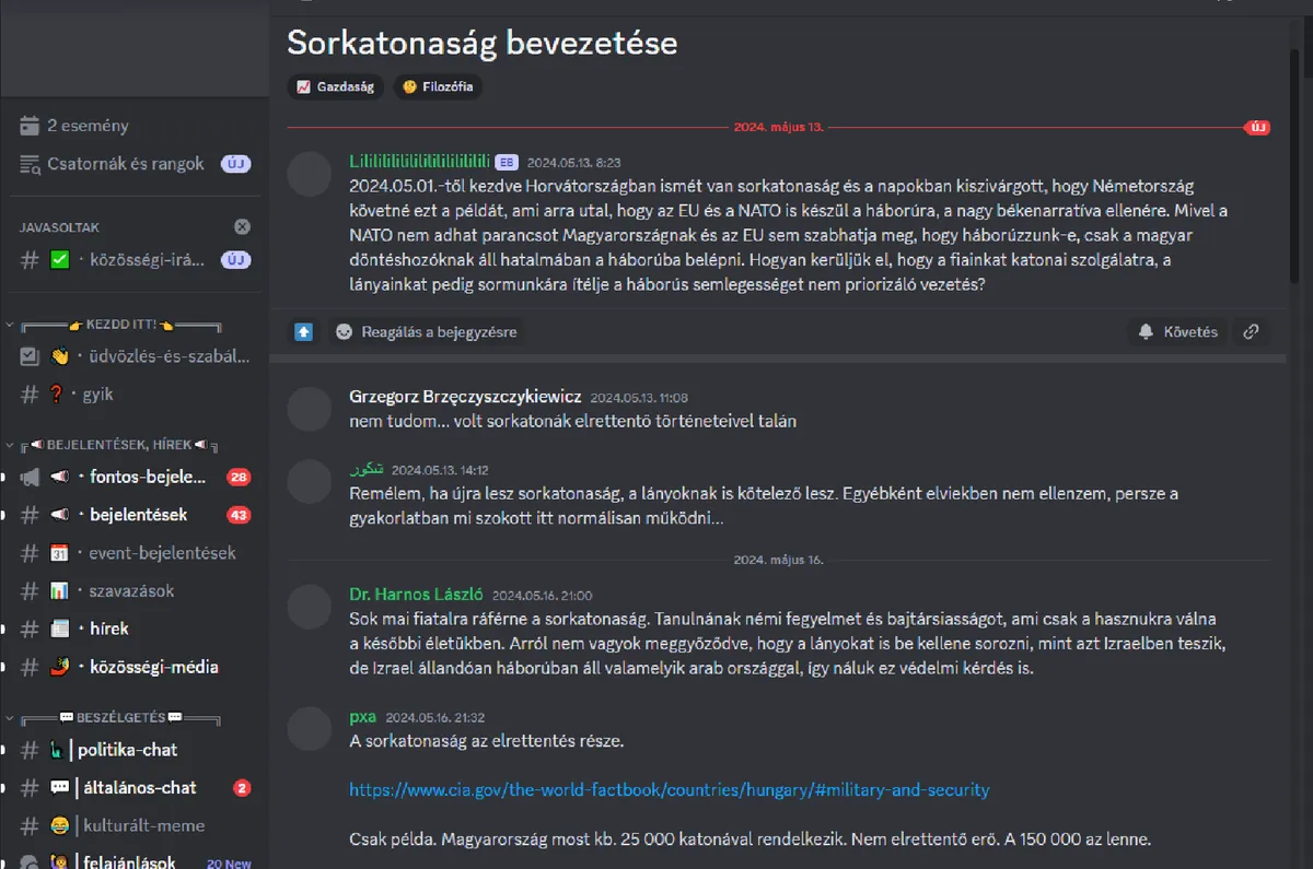 Súlyos mondatok olvashatók a Magyar Péterhez tartozó Discord-csoport Sorkatonaság bevezetése című chatszobájában. A Magyar iránti szimpátiájáról ismert Szeretlek Magyarország úgy mutatta be ezt a programot április 6-án, hogy „Magyar Péter aktivistáinak fő kommunikációs felülete”.