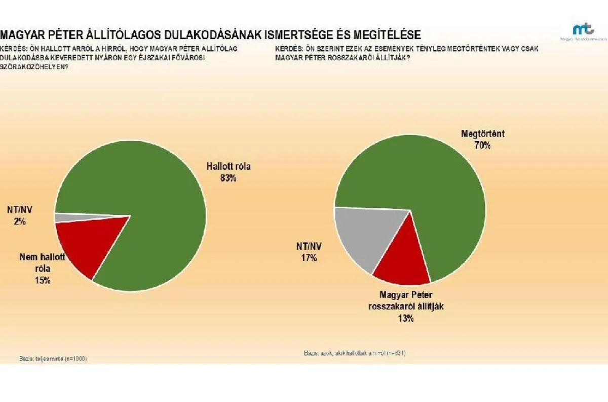 Az EP-választás után diszkóbotránya lett Magyar Péter legismertebb akciója, a felnőtt magyar lakosságot reprezentáló válaszadók több mint négyötöde (83 százalék) hallott arról a hírről, hogy Magyar Péter dulakodásba keveredett nyáron „egy éjszakai fővárosi szórakozóhelyen”. A hírről értesültek 70 százaléka tartja igaznak ezt a hírt, mely ráadásul a hírt ismerő baloldali szavazók többsége, így a Tisza-szavazók 55 százaléka és a DK-MSZP-P – koalíció szavazóinak 52 százaléka szerint is megtörtént, s csak kevesebb mint harmaduk (28 és 30 százalék) gondolja úgy, hogy ezt csak Magyar Péter rosszakarói állítják.