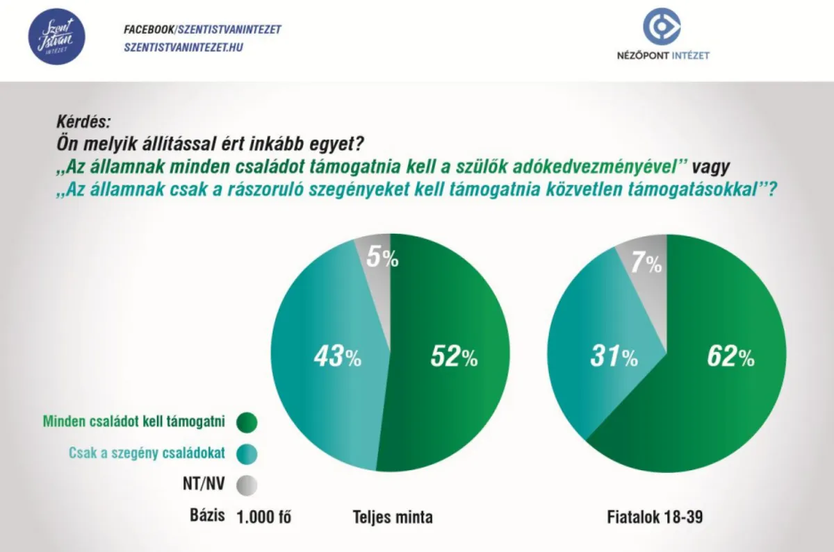 A következő kérdés arra irányult, hogy a magyarok milyen formában tartják a leghatékonyabbnak a családok állami segítését: mindenkinek járó adókedvezmény formájában, vagy csak a rászorulóknak nyújtott célzott támogatásként. Az eredmények egyértelmű társadalmi preferenciát mutatnak az univerzális, minden szülőnek járó adókedvezmények tekintetében. A válaszadók több mint 52 százaléka ezt a megoldást támogatná, szemben a 43 százalékkal, akik szerint a támogatásokat csak a rászoruló, szegényebb családoknak kellene folyósítani.