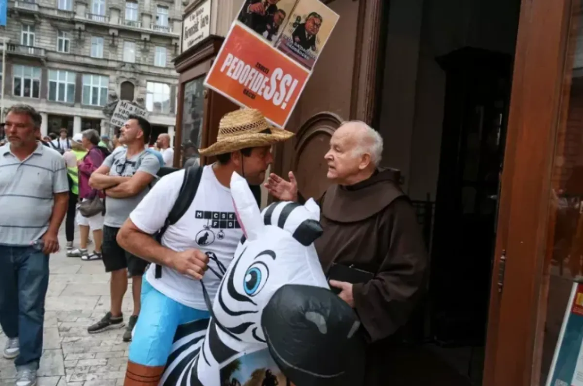 „A demonstrálók közül páran bementek a templomba, köztük az egyik zebra jelmezes résztvevő. Majd megjelent egy ferences szerzetes egy Bibliával a kezében a templom ajtajában.” A XXI. Század Intézet vezető elemzője felidézte: