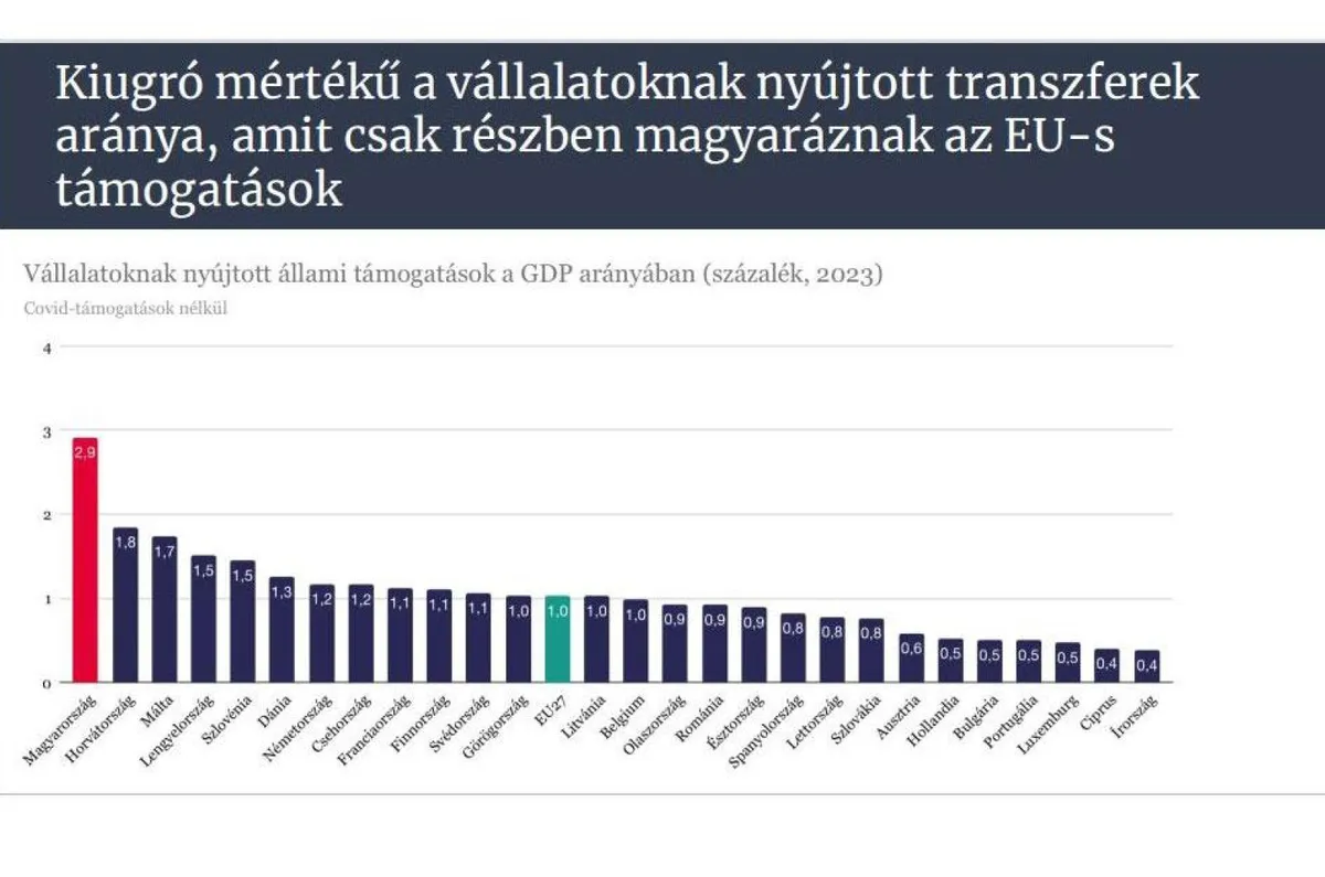 Hogy ez teljesen egyértelmű legyen, arról a következő dia árulkodik, amelyben azt írja Kármán a régiós összehasonlításában, hogy „kiugró mértékű a vállalatoknak nyújtott transzferek aránya, amit csak részben magyaráznak az EU-s támogatások”.