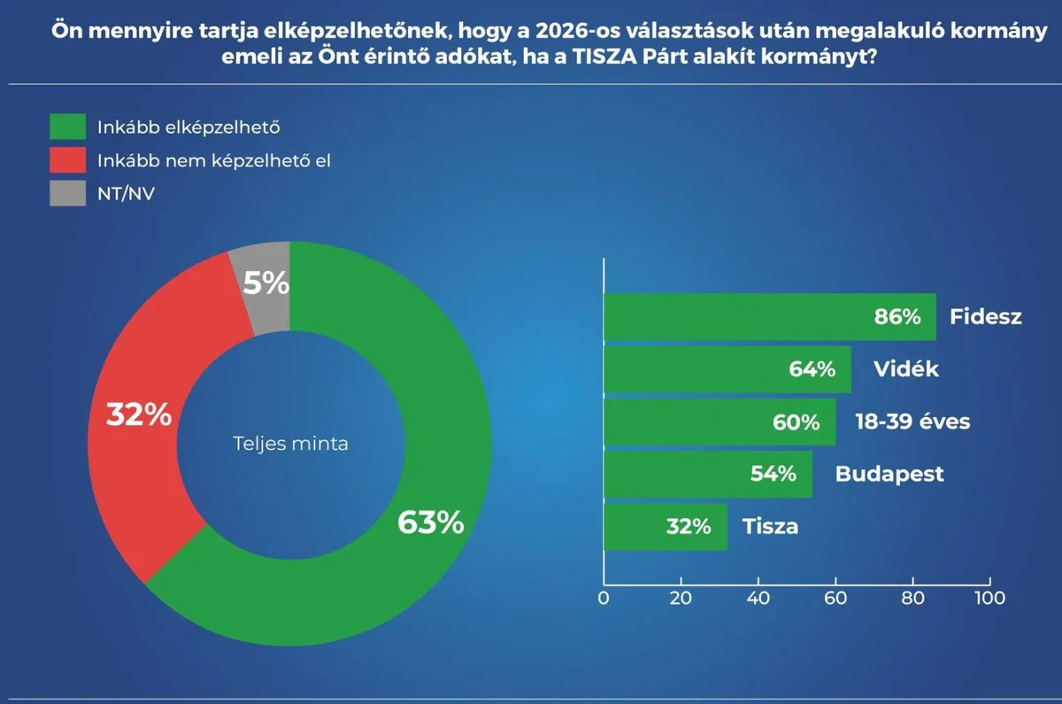 Az Alapjogokért Központ felmérése szerint a szavazókorú magyarok 63 százaléka szerint a 2026-os választások után a Tisza Párt megemeli az adókat. Mindössze a megkérdezettek 32 százaléka hisz Magyar Péternek, aki a botrány kirobbanása óta lehetetlenebbnél lehetetlenebb tervekről beszél, miközben a hozzá közelálló baloldali szakértők a progresszív adózást támogatják. A Tisza Párt adóemelésre vonatkozó javaslata a családi adókedvezmények rendszerét is megszüntetné, a progresszív oldal számára kedves „adóreform” keretein belül. Tarr Zoltán arról is beszélt az etyeki fórumon, hogy nem mondhat el mindent, mert „akkor megbukunk” – vagyis elismerte, hogy számos olyan szakpolitikai javaslata van még a Tisza Pártnak, ami nem találkozik a magyarok igényeivel.