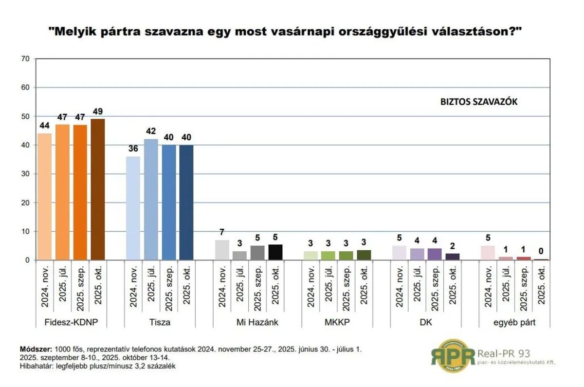 Magyar Péter pártjának változatlan támogatottsága (40 százalék) mellett a kormánypártok erősödtek a pártok versenyében, miközben a Mi Hazánk épp a bejutási küszöbön áll (5 százalék) október közepén – derült ki a Real-PR legfrissebb közvélemény-kutatásából. A felmérésből az is kiolvasható, hogy más párt nem jutna az parlamentbe a kutatás szerint.