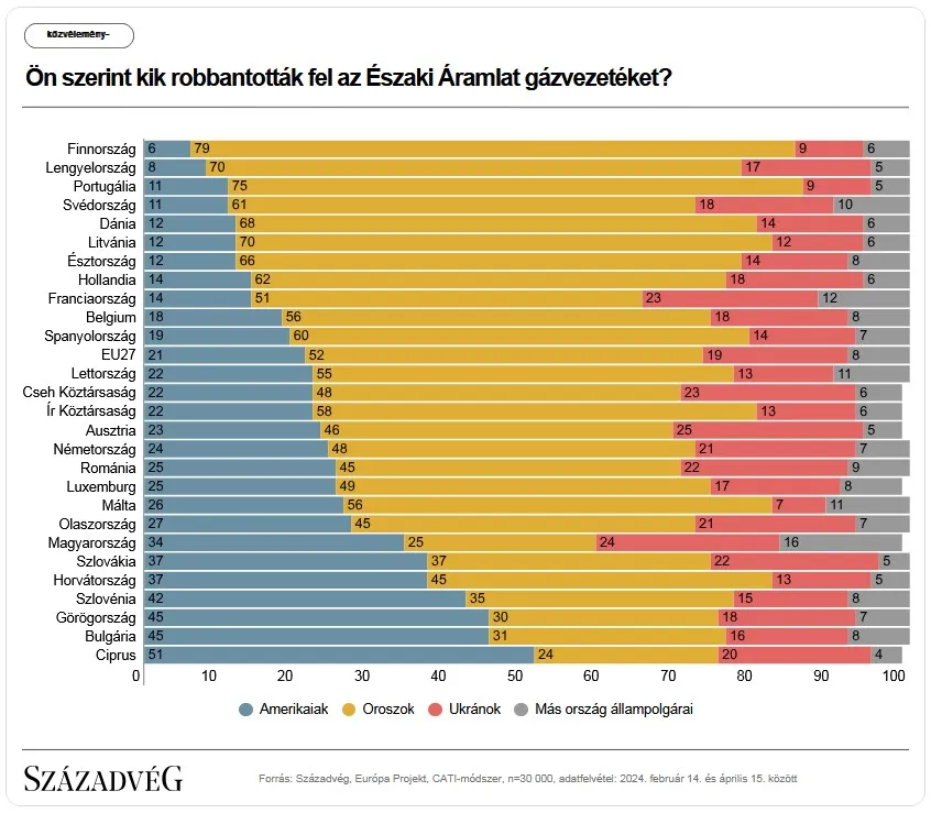 A kutatási eredmények alapján a véleménnyel rendelkező uniós polgárok fele szerint Oroszország robbantotta fel a vezetékeket, és Lengyelországban, valamint a balti, illetve skandináv országokban az elméletnek nagy többsége van. Ezzel szemben öt olyan tagállam azonosítható, amelyben legalább a relatív többség Amerika felelősségét valószínűsíti és meglepő módon egyetlen országban sem domináns a jelenleg uralkodó elmélet, amely szerint egy ukrán csapat állhat a terrorakció hátterében.