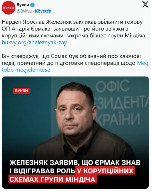 - fogalmazott a Jermak érintettsége kapcsán megszólaló ellenzéki képviselő, hozzátéve, hogy Jermak tudott a korrupciós ügyekről, és szoros kapcsolatban állt Mindiccsel, aki szerinte elősegítette Jermak kinevezését az Elnöki Hivatal élére.