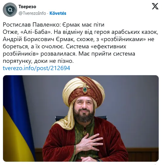 A politikus szerint, ha Jermak érintettsége tényszerűen bebizonyosodik, akkor biztosra vehető az is, hogy a háborús maffiahálózat Zelenszkij hallgatólagos beleegyezésével működött.