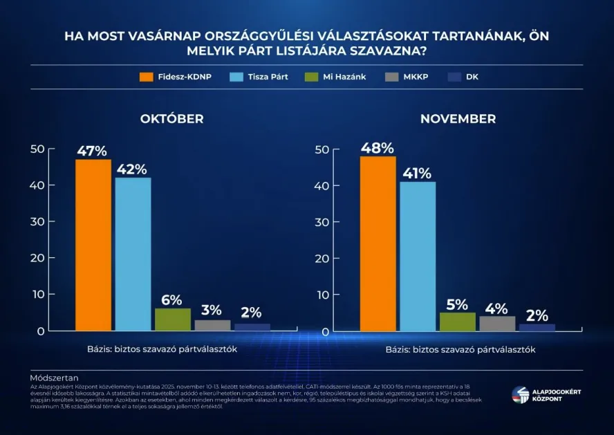 Az Alapjogokért Központ havi napirendelemzése és kutatásösszegzése alapján egyértelműen fordult a nyár előtti trend: a novembert és az őszi kampányidőszakot is a Fidesz nyerte, a Tisza pedig tartósan csúszós lejtőre került – olvasható az Alapjogokért Központ elemzésében, amelyről − az Origó számol be.