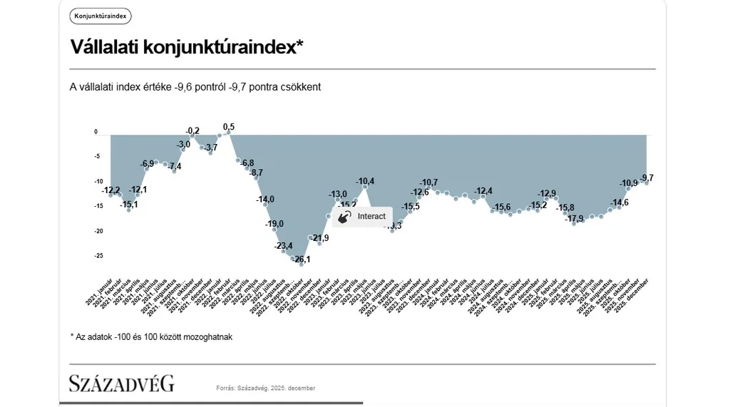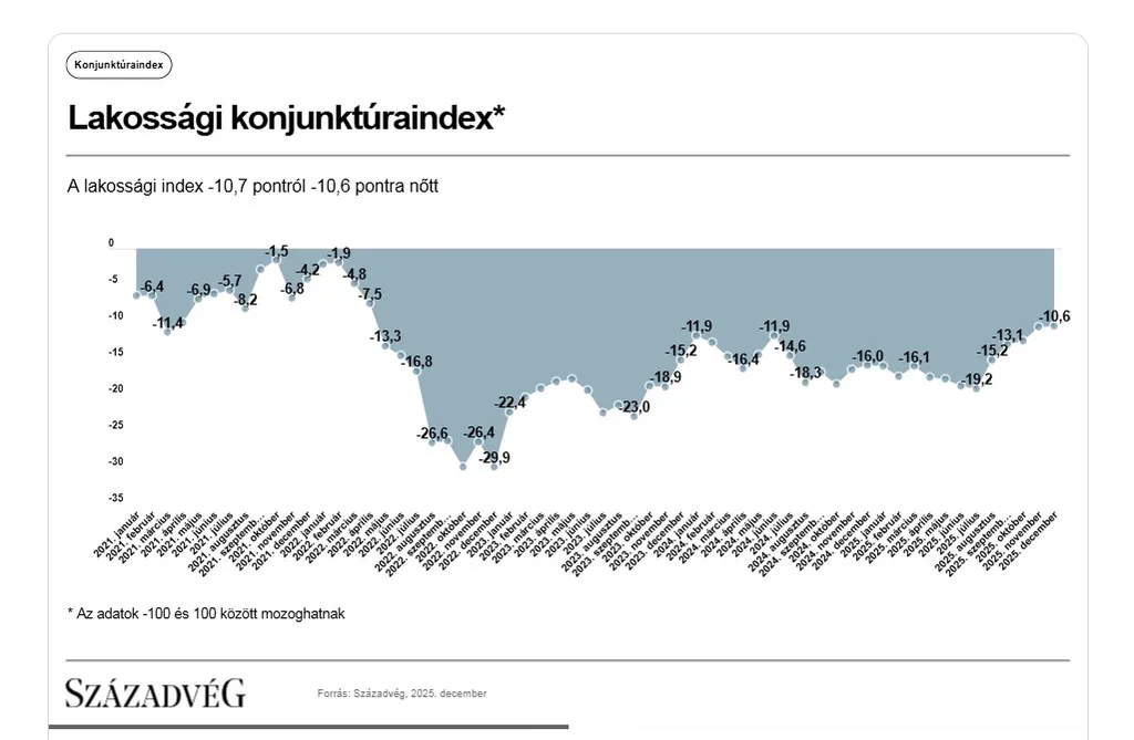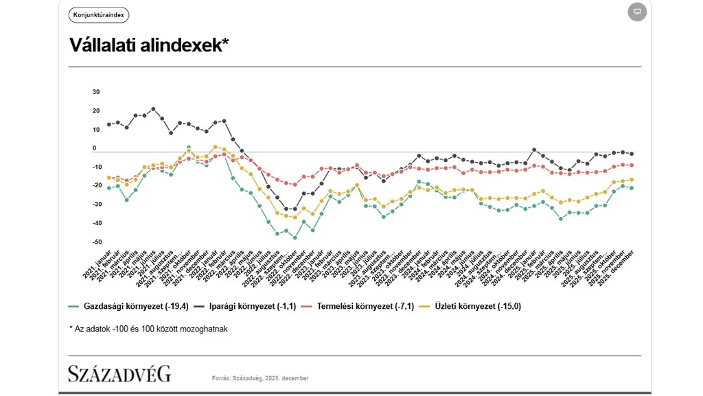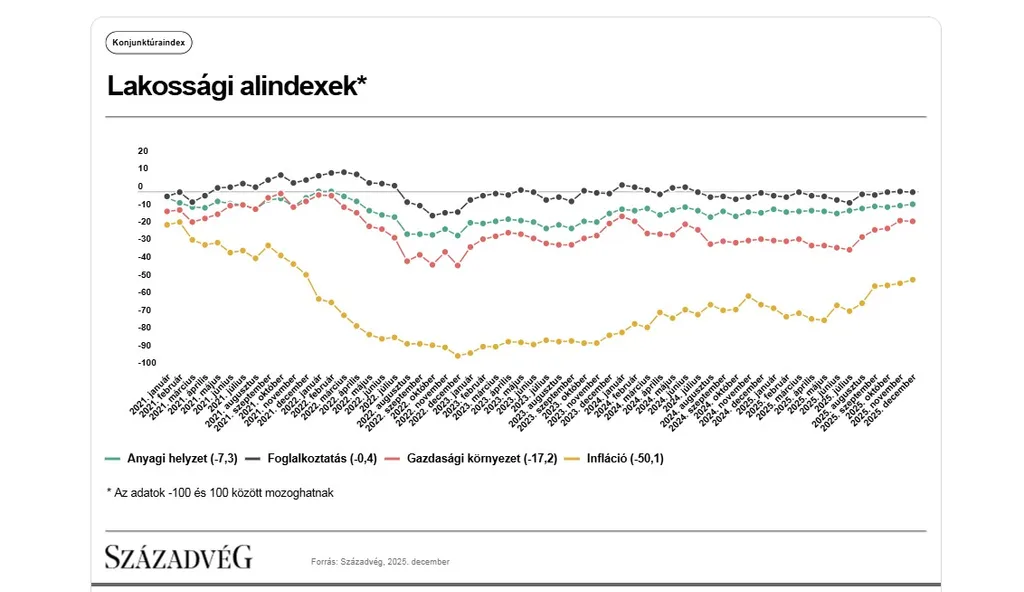 A Századvég Konjunktúrakutató Zrt. 2025. decemberi felmérése alapján a lakosság gazdasági várakozása (+0,1 indexpont) és a vállalatok gazdasági közérzete is (−0,1 indexpont) jóformán stagnált az előző hónapban mért értékhez képest.