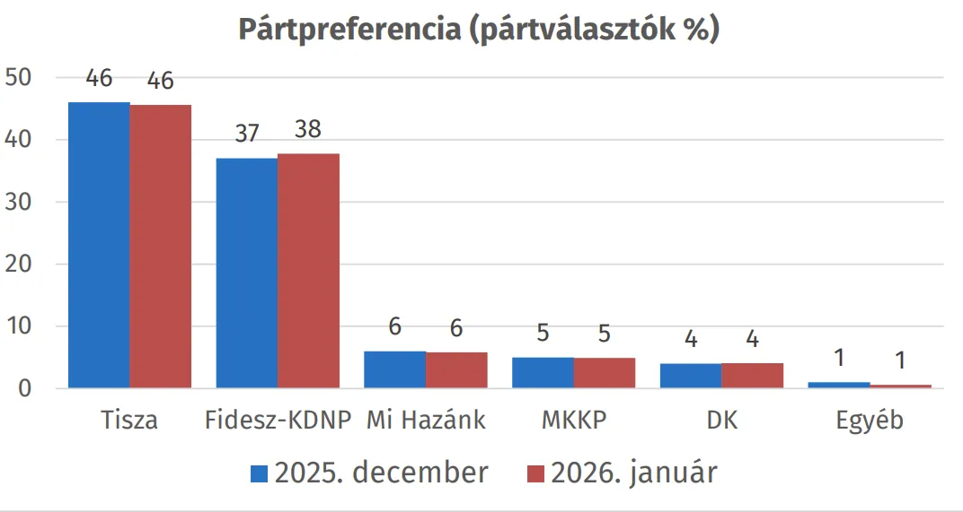 A pártválasztók körében a Tisza továbbra is 46 százalékon áll, a Fidesz-KDNP támogatottsága egy százalékponttal nőtt, 38 százalékra. A Tisza előnye 8 százalékpont.
