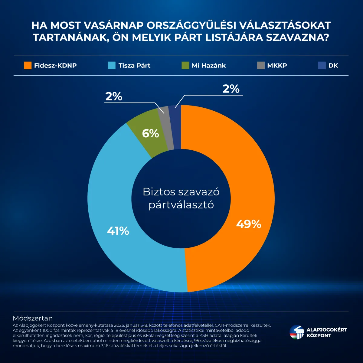 A januári adatfelvétel alapján fenti két párton kívül csak a Mi Hazánk jutna be a parlamentbe, őket a biztos szavazó pártválasztók 6 százaléka támogatja. Ezúttal sem érte el a bejutási küszöböt a Magyar Kétfarkú Kutya Párt (2 százalék), valamint a Demokratikus Koalíció (2 százalék).