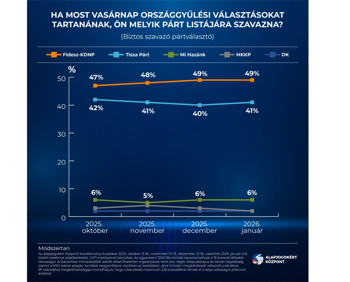 Az Alapjogokért Központ október óta havi rendszereséggel publikálja országosan reprezentatív pártpreferencia-méréseit. Az őszi politikai szezon indulása óta a népszerűségi trendek egyértelmű helyzetről árulkodnak: a Fidesz-KDNP vezető pozícióját stabilizálta, előnyét pedig a kezdeti 5 százalékpontról csaknem megduplázta. A kormánypártok jelentős – de nem behozhatatlan – fölénye 2026 év elején is megmaradt: a biztos szavazó pártválasztók 49 százaléka szavazna egy most vasárnap esedékes választáson listájukra, míg Magyar Péterék megtorpantak, a Tiszát támogatók aránya 40-42 százalék között mozgott az utóbbi hónapokban. Mindez jól mutatja, hogy az ellenzéki formáció számára az év eleje sem bizonyult sikeresnek, részben a korábbi ügyek utóhatásai, részben az „újévi” – viták miatt.