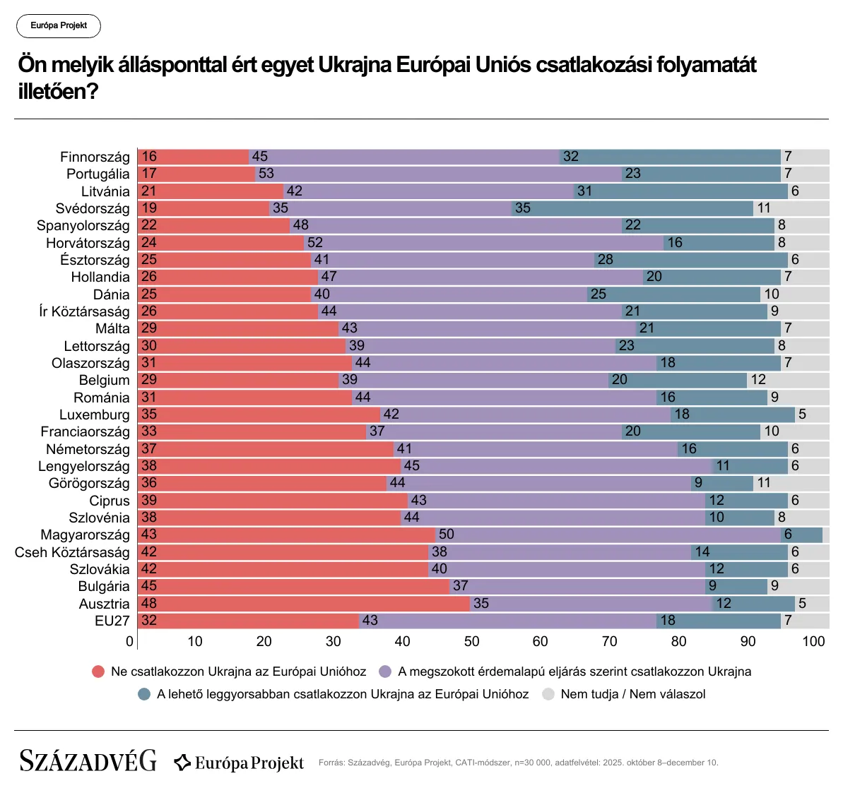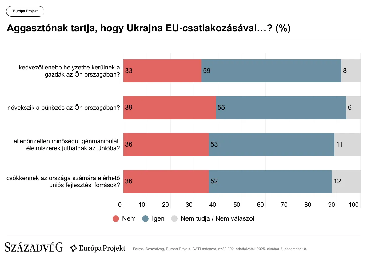 Az uniós polgárok többsége minden tagállamban elutasítja a brüsszeli kezdeményezést. A Századvég legfrissebb Európa-projekt-kutatása szerint a felnőtt lakosság mindössze 18 százaléka támogatná Ukrajna azonnali uniós felvételét, 43 százalék úgy véli, hogy a csatlakozásnak a megszokott, érdemalapú eljárás szerint kellene történnie, míg 32 százalék teljes mértékben ellenzi Ukrajna uniós tagságát – írja a Századvég.