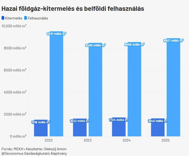 Magyarország saját földgázkitermeléssel is rendelkezik, amely ugyan már rég túl van a történelmi csúcson, de továbbra is érdemi hozzáadott értéket képvisel. 2025-ben a hazai földgázkitermelés több mint 1,6 milliárd köbméter volt, ami 4,8%-kal alacsonyabb, mint 2024-ben, ugyanakkor 1,1%-kal magasabb, mint 2023-ban. A hazai földgáztermelés stabilan a belföldi felhasználás 18–20%-át fedezi. Az elmúlt évben a hazai földgázfelhasználás 18,4%-a származott belföldi kitermelésből - írta az Oeconomus.