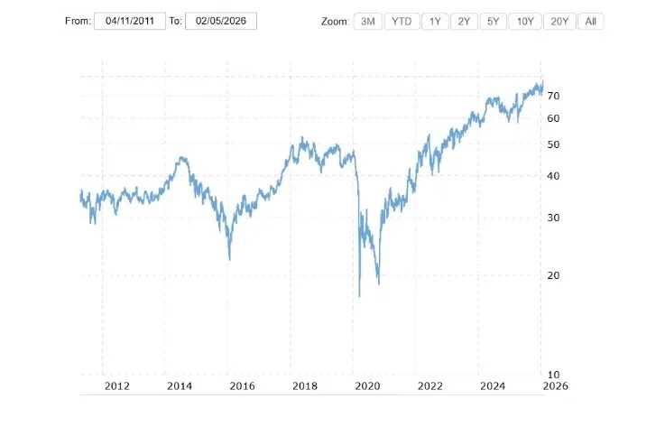 A Shell-részvények értéke ugyanis a háború előtt évekig stagnált: egy részvény 2014 végén csak 38 dollárt ért, 2021 végén (közvetlenül a háború kitörése előtt) pedig 37-et. Az orosz energia kiszorítása miatt viszont meredeken emelkedni kezdett, 2024 végén már meghaladta az 59 dollárt, mára pedig elérte a 75-öt. Az alábbi grafikonból is jól látszik, hogy a Shell egy évtizedes megtorpanásból állt fel 2022 és 2026 között a háborús profit miatt.