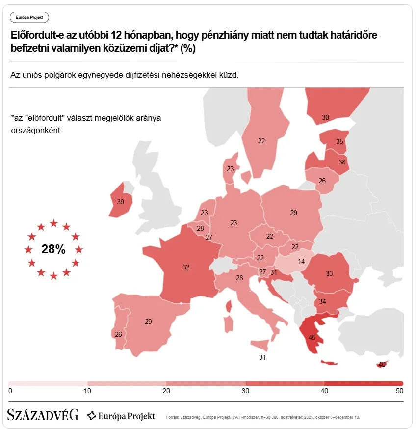 A díjfizetési nehézségekkel küzdők aránya is Magyarországon a legalacsonyabb (14 százalék), amit Ausztria és Svédország (21-21 százalék) követ. A lista végén – a fűtési problémáknál tapasztaltakhoz hasonlóan – Görögország (45 százalék) és Ciprus (40 százalék) áll, amelyek mellett Írország (39 százalék) is megjelenik.