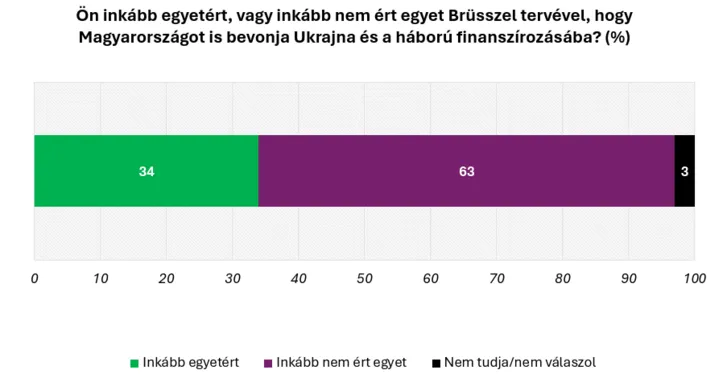 A felmérésben több aktuális politikai kérdés is előkerült. Egyrészt arra keresték a választ, hogy a megkérdezettek inkább egyetértenek-e, vagy inkább nem Brüsszel azon tervével, amely Magyarországot is bevonná Ukrajna és a háború finanszírozásába. Az eredmény egyértelmű.