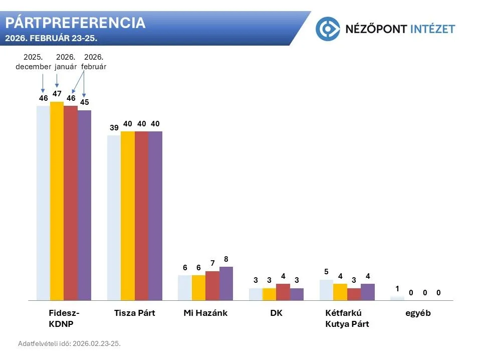 – A Nézőpont Intézet szerdai nappal véget ért közvélemény-kutatása szerint továbbra sincs változás a pártversenyben. Egy most vasárnap tartott országgyűlési választáson a Fidesz–KDNP legvalószínűbb listás eredménye 45 százalék lenne, míg a Tisza-lista negyven százalékot kapna. Rajtuk kívül csak a Mi Hazánk Mozgalom tűnik biztos befutónak, az eddig mért legmagasabb, nyolcszázalékos eredménnyel – közölte a Nézőpont Intézet. Azt írták: