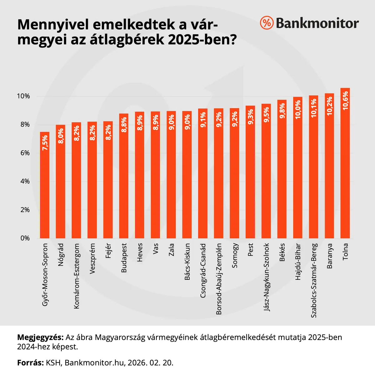 A Budapest és vidék közötti bérszakadék folyamatosan szűkül. Míg 2019-ben a legalacsonyabb bruttó átlagkeresettel bíró Szabolcs-Szatmár-Bereg megye bérszínvonala a budapestinek csupán 55,6 százalékát érte el, ez az arány 2025-re 61,5 százalékra emelkedett. Tehát az alacsonyabb átlagbérekkel rendelkező vármegyék felzárkózási folyamata, ha tyúklépésben is, de halad - emelték ki.
