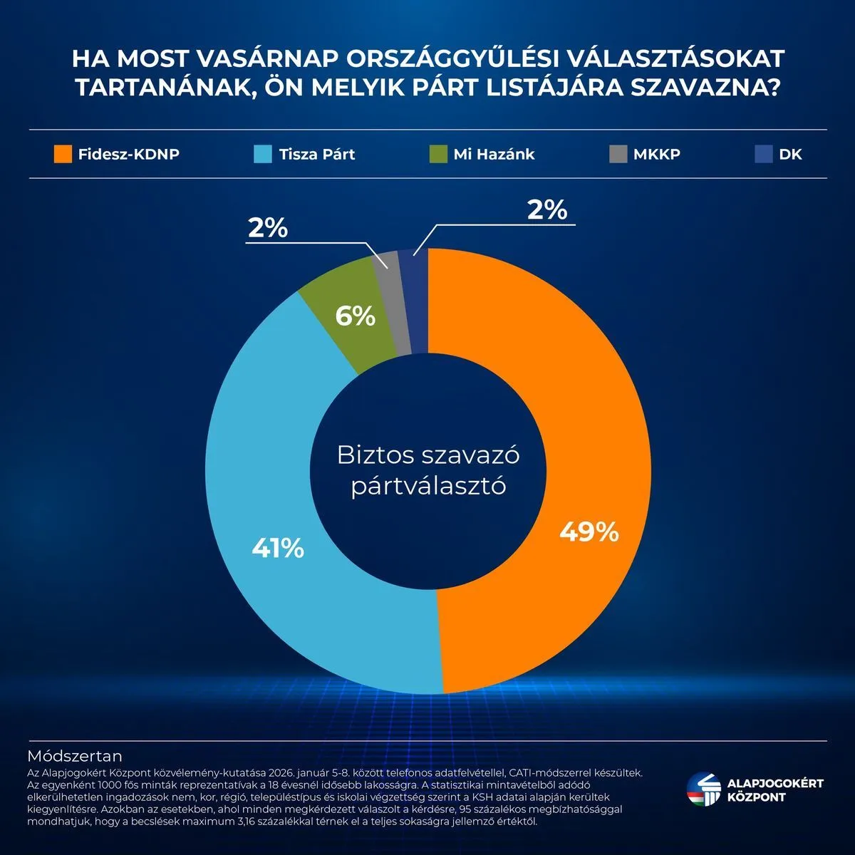 A kutatási igazgató emlékeztetett: az Alapjogokért Központ legutóbbi pártpreferencia adatai szerint – amelyek még januárban jelentek meg – a biztos szavazó pártválasztók körében a Fidesz–KDNP stabil előnnyel vezet.