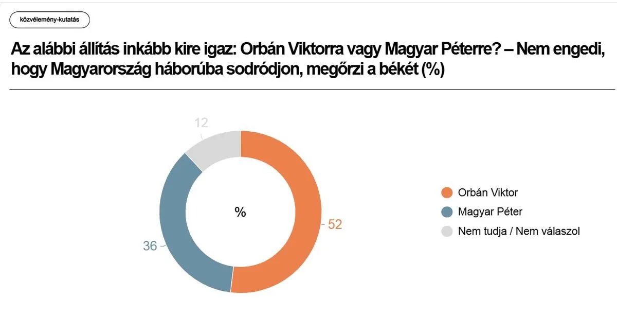a válaszadók többsége – 52 százalék – szerint Orbán Viktor nem engedné háborúba sodródni az országot, és meg tudná őrizni a békét. Magyar Péterről ezt csak 36 százalék feltételezi.