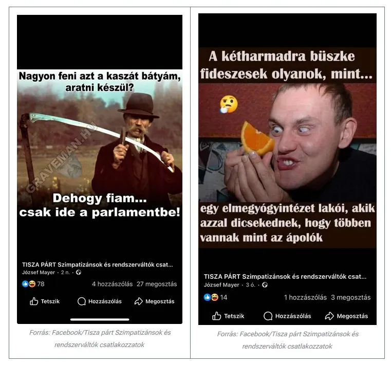 A Tisza Párt elkötelezett támogatói viccesnek ható képekkel igyekeznek emberi mivoltukban megalázni a kormánypárti szavazókat, illetve politikusok megölésére buzdítanak. A tartalmak több nap után is megtalálhatók a Tisza Pártot támogató, több mint 16 ezer főt számláló csoportban.