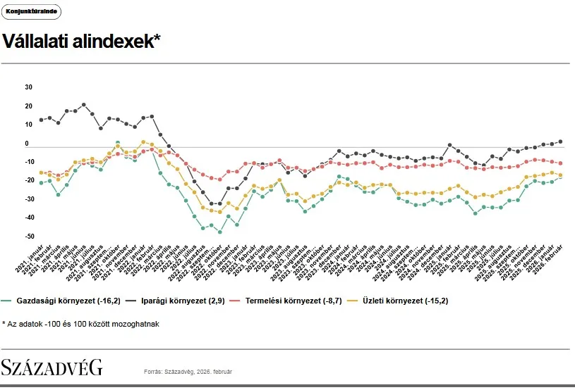 A vállalati felmérésben februárban kettő alindex értéke emelkedett, kettő alindexé pedig csökkent. Az iparági környezet alindex értéke 1,5-ről 1,9-re nőtt, továbbá a gazdasági környezet alindex értéke −18,8-ről −16,2-re erősödött. Eközben a termelési környezet alindex −7,9-ről −8,7-re, az üzleti környezet mutatója pedig −13,8-ről −15,2-re csökkent.