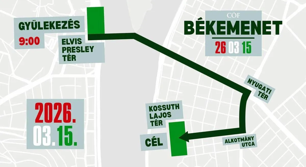 A március 15-i Békemenet gyülekezője 9 órakor lesz a budapesti Elvis Presley téren, majd 11 órakor indul el a menet